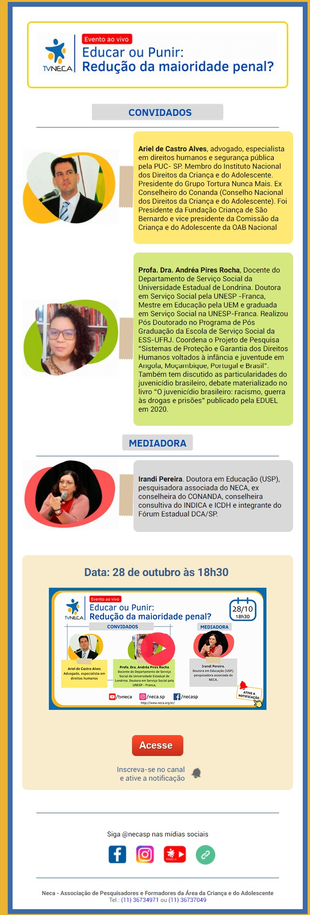 Não perca, na próxima quinta-feira, dia 28 de outubro, live realizada pela TV Neca sobre a redução da maioridade penal a partir das 18h30.