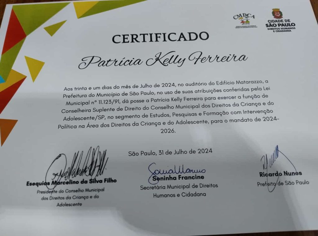 Patrícia Kelly foi eleita conselheira suplente no segmento Estudos, Pesquisas e Formação com Intervenção Política na Área da Criança e do Adolescente, para este mandato.